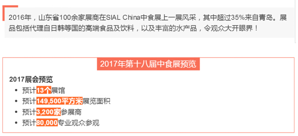 今天,第十八届中国国际食品和饮料展览会(SIAL China中食展)在青岛举办了新闻会。随着2017年SIAL China中食展展位销售渐入尾声,2017中食展观众预登记也已正式开启,专业观众可通过中食展官方网站及官方微信平台进行在线预登记换取免费胸卡。