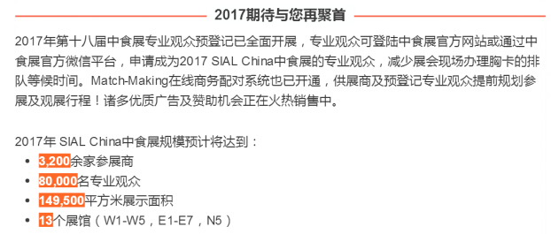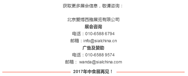 在过去的十七年里,众多展商跟随着中食展的步伐,与中食展一同初露锋芒,一同发展壮大,越走越稳健,更期待着在未来共同收获更多的成功。而中食展也必然期待着与更多新老展商携手,继续谱写共同辉煌的新篇章!