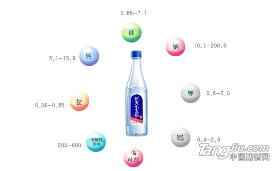 航天小五泉的原水富含锂、锶、偏硅酸等对人体有益的矿物质,可对高血压,心血管疾病有缓解作用。根据不同消费者的需求,航天小五泉在主营的矿泉水、弱碱水外,还将增加学生用水、女士专用水、婴儿专用水、泡茶用水、驾车用水、功能饮料等系列产品。