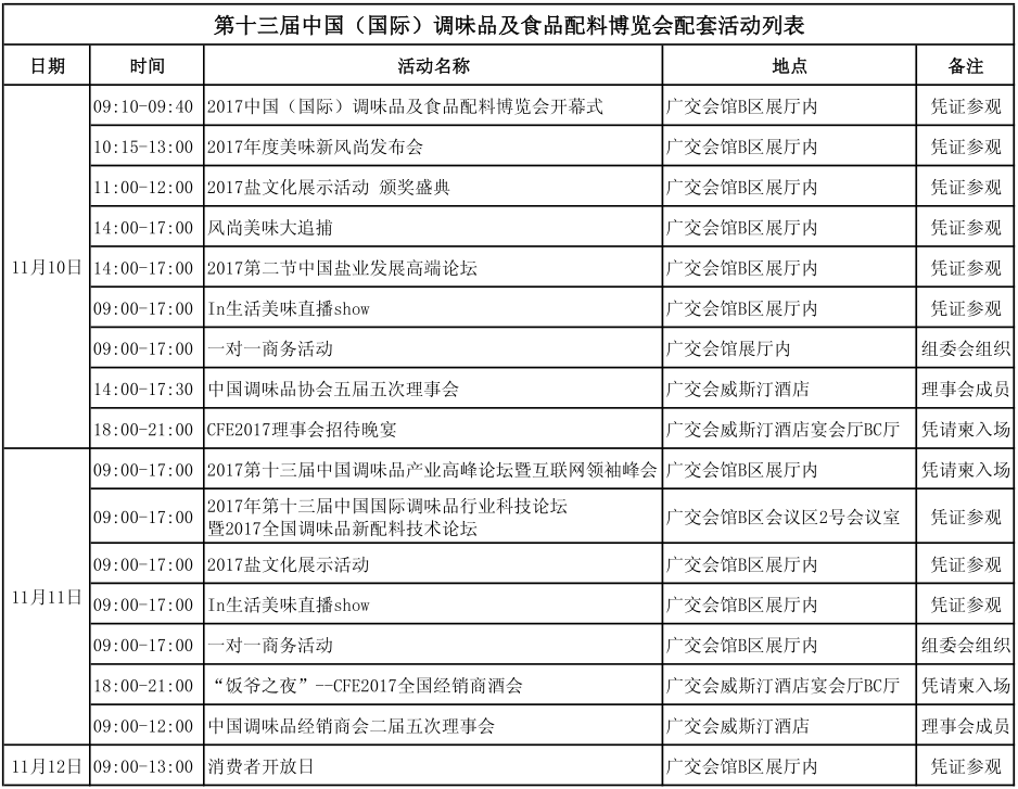 由中国调味品协会主办的2017第十三届中国(国际)调味品及食品配料博览会将于11月10-12日在广州中国进出口商品交易会展馆(广交会馆)隆重举办。截止目前,本届博览会招商工作进展顺利且取得了丰硕的成果:调味品品牌云集、盐企聚首百家秀、美味新生活style火爆助力、大牌机械设备厂商焕新来炫......当然,还有备受瞩目的展会同期高端论坛与精彩活动!经过CFE中国调味品展组委会的谨慎调研、严密筛选和精心策划,切合行业发展现状、聚焦热点行业话题的博览会同期配套活动今日新鲜出炉。