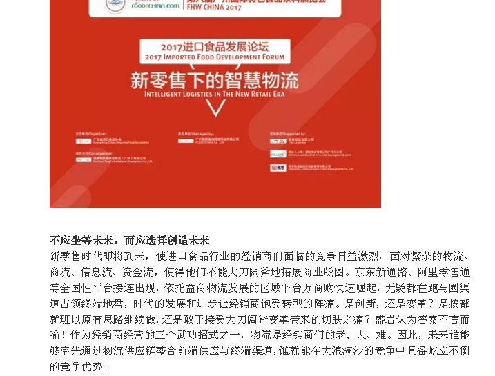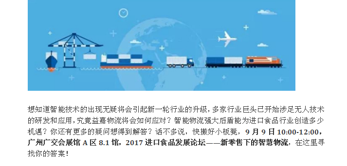 首页展会资讯展会新闻 展会新闻 想知道智慧化物流如何引领行业热潮?9月9日来这里为你揭秘! 未知 2017-09-07 12:21 展会新闻 上一篇细数进口食品检验检疫的那些事儿,99%居然你们都不知道?!都说进口食品检验检疫除了要拼产品质量,还要拼你对检验检疫法规的熟悉程度。各位在行业多年的老司机肯定 上一篇第十九届葡萄酒烈酒展览会邀请函尊敬的专业人士: 第十九届葡萄酒烈酒展览会(简称葡萄酒烈酒展)将于 2018年5月14日在上海国家会展中心举 相关文章 2018.11.1-3,相约上海烘焙狂欢节@2018秋季焙烤展 & 家庭烘焙展 2018中部酒类食品行业——新营销 新趋势 新机遇 2018第13届山西糖酒会蓄势待发——集全产业链,汇业界翘楚,打造 2018中国(海南)葡萄酒大会6月15日举办 5月聚势南京!2018中国华东国际糖酒会带你探寻酒类食品高质量增 北京世界食品博览会助力2018天津食品行业开拓国内外市场说明会— 瑞城打造华东国际糖酒会 助力行业新发展 2018第7届广州国际糖酒会 世博威.高端饮用水展打造饮用水行业产销共赢平台! 2018上海国际烘培展,招展工作火热进行中