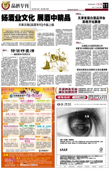 逢年过节,无酒不成礼,商务洽谈无酒不诚意,快节奏的现代生活中,人们更需要注意在饮酒时树立健康的饮酒观念。本着健康饮酒、理性消费的理念,倡导人们健康饮酒,引导人们关注白酒自身的品质,由天津日报主办的天津市首届白酒品评会,将于近期隆重推出。借此良机,我们诚招有意向合作的白酒品牌,共同为振兴天津酒业市场贡献绵薄之力。活动期间,《天津日报》将刊登“受天津人喜爱的白酒候选品牌”,我们会全方位地调研,并吸纳各方建议,将深受天津市民喜爱的白酒品牌一一罗列。