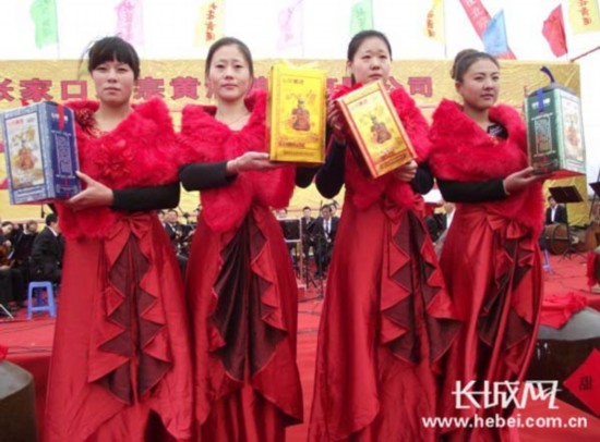 美女展示各种极品北宗黄酒。长城网 李宏 摄