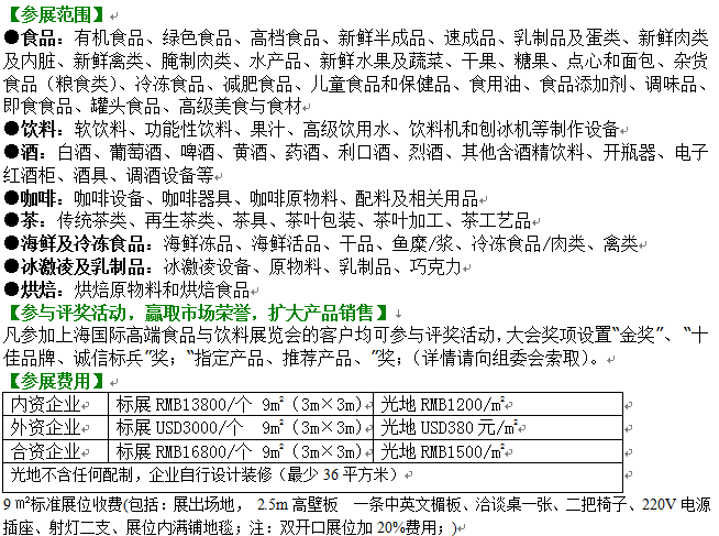 上海高端食品与饮料展以酒店、餐厅、酒吧、咖啡馆、会所、商铺及其它商业空间为目标群体,专门打造了一个食品与饮料,咖啡与茶等高级食品食材的一站式供货和解决方案的专业展会,将为食品展商提供一个近超过10万名买家的酒店餐饮业一站式采购平台。