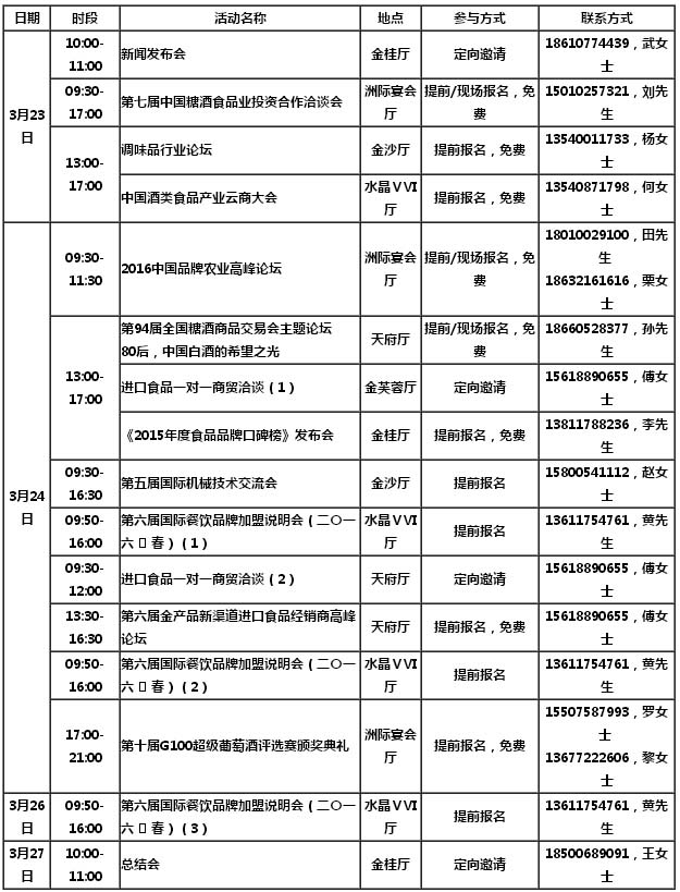 首页展会资讯展会追踪 展会追踪 2016年第94届春季成都全国糖酒会主要活动 中国糖酒网 2016-02-19 18:12 展会追踪 2016年春季(成都)全国糖酒商品交易会 时间:3月24日-26日 地点:成都世纪城国际会议中心 主要活动: 2016年春季(成都)全国糖酒商品交易会 时间:3月24日-26日 地点:成都世纪城国际会议中心 主要活动: 上一篇2016 SIAL China酒类综合馆:酒的世界,世界的酒2016年5月5日-7日,一年一度的中国国际食品及饮料展览会(SIAL China)将照常在上海新国际博览中心举办。2 上一篇2016年春季全国糖酒会布展酒店及会展中心展区分布第94届全国糖酒商品交易会于2016年3月24-26日(酒店展:2016-3月203月23)在成都举办,与往届会不同,根据 相关文章 第六届进博会配套活动申办启动啦! 第99届全国糖酒会将亮相长沙国际会展中心 2018山西秋季糖酒会日程安排及亮点活动 2018第十一届河南省(安阳)国际糖酒食品交易会参展活动通知 2018第12届全国食品博览会暨酒业展览会5月20日即将开幕 鲜生活 2018 SIAL China中食展九大活动精彩连连 2018第12届全国食品博览会暨酒业展览会邀 请 函 2018济南第12届全国食品会邀请 重庆秋糖——全国糖酒会主要活动前瞻