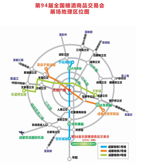 路线指引:成都地铁1号线(由成都市中心乘坐地铁1号线到达世纪城站经由C出口,即可到达成都糖酒会主会场-世纪城新会展)