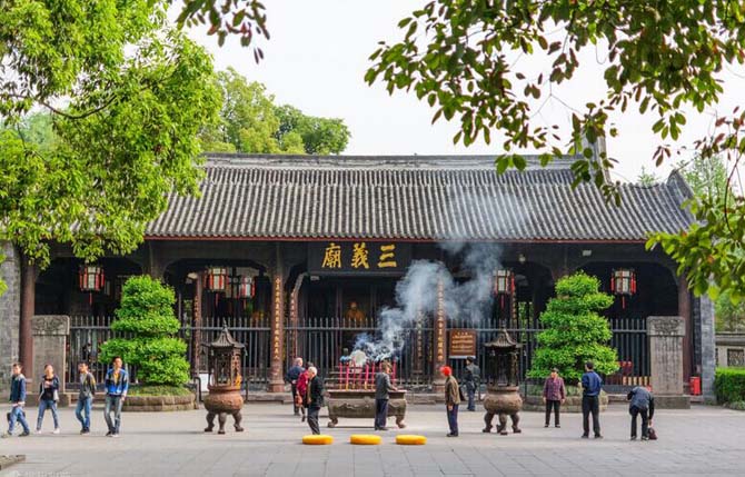 祠内供奉刘备、诸葛亮等蜀汉英雄塑像50尊,区域内还有众多的关于诸葛亮和三国文化的碑刻、匾额等。 武侯祠的园林区,位于武侯祠西侧,原是民国时期四川省主席刘湘的墓园,区域内有石牌坊大门、三洞门、四方亭、荐馨堂、墓室等建筑,是西南地区惟一一座北方风格的陵园建筑群。
