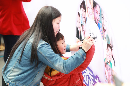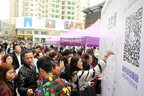 11点40分,王旭峰领签“儿童饮品0添加剂立法”百万签名活动,现场观众排起长队,纷纷参与签名。