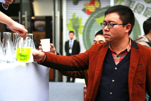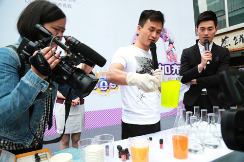 昨天上午11时,在春熙路银石广场,王旭峰现场演绎了“添加剂变身各种饮料”的魔术。只见王旭峰拿出一个装有几十瓶添加剂的小箱子,应现场三名观众要求,用柠檬黄、亮蓝、香精、增稠剂等十几种添加剂,兑上水,瞬间生产处如假包换的添加剂饮品“苹果汁、橙汁、绿茶等,颜色、香味跟真的一样,连口感也相差无几。在场的消费者大呼可怕,一个太婆说,以后再不敢让小孙孙乱喝外面的饮料了。