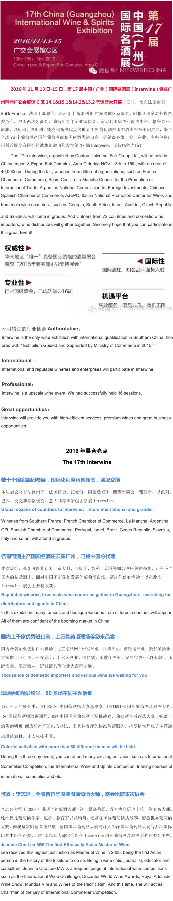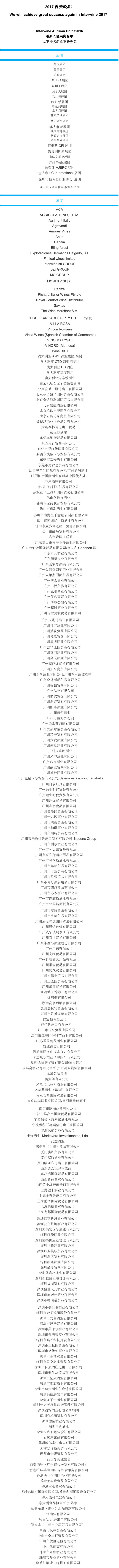 首页展会资讯展会追踪 展会追踪 Interwine 11月13-15日全球酒商云集,第一批名单公布 中国糖酒网 2016-10-11 18:40 展会追踪 上一篇2016第十二届湖南糖酒食品交易会展后报告【展会概况】 展出面积:32000余平方米 参展企业:830家企业 同期活动:11场次 参观区域:湖南、湖北、江 上一篇2016福州糖酒会盛大开幕 新品发布吸睛无数第95届全国糖酒食品交易会昨日在福州海峡国际会展中心开幕,展会时间为2016年10月20-22日,为期3天。 相关文章 中国国际葡萄酒及烈酒品酒会:获奖名单公布 直击中食展 | SIAL创新大赛金银铜奖公布! 2017 SIAL 创新大赛入围名单TOP10权威发布 第一元素调节心情功能饮品携手CCTV艳惊2015秋季糖酒会 调节心情功能饮料“第一元素”荣获“2015年度最佳新品类奖” 秋季糖酒交易会聚焦情绪产业,第一元素领跑心灵保健行业 第四届三峡十大特产评选结果将公布 第一届中国长春北湖国际消夏啤酒节圆满落下帷幕 五年沉淀,打造中国第二大食品添加剂配料展—中西部第一展 全球茶业第一展再增茶机械新展区