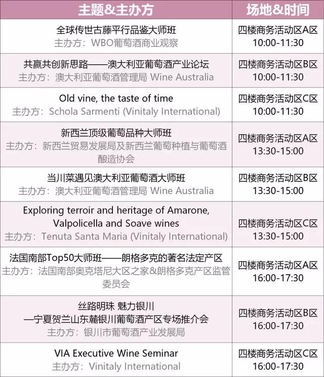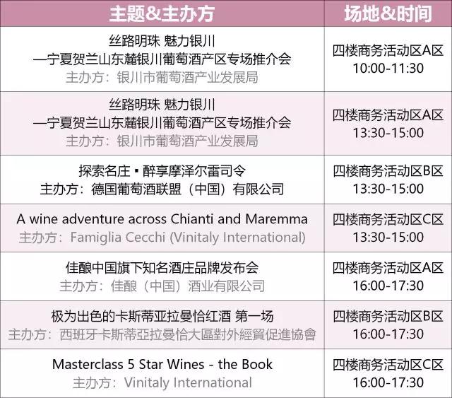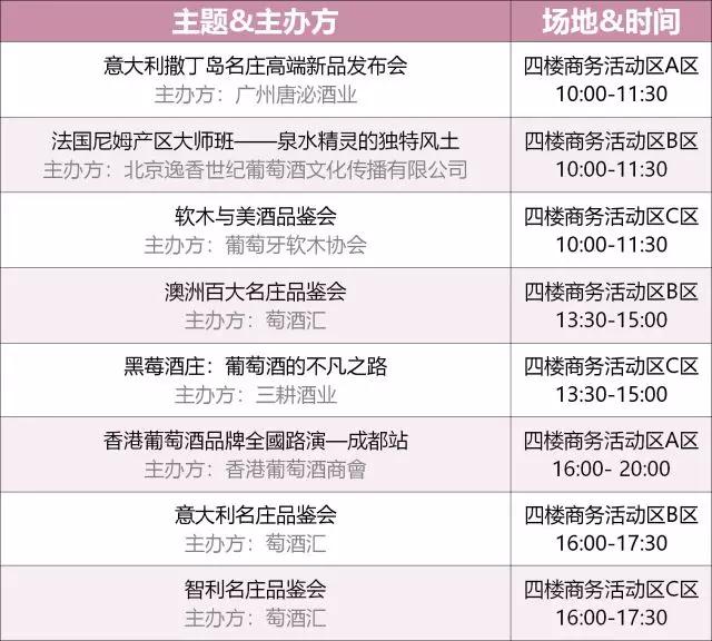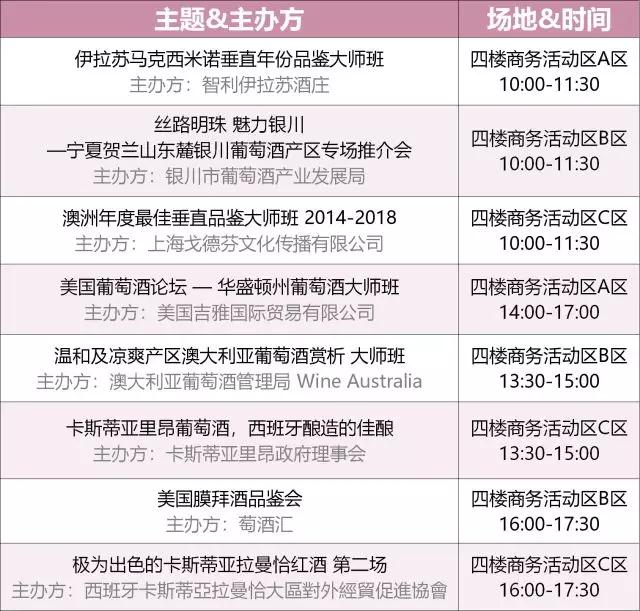 国家产区协会代表、成都各外国领事代表、酒业“大佬”(名企老板)、行业权威(如James Halliday)、MW(Master of Wine 葡萄酒大师)如赵凤仪、MS(Master of Sommelier 侍酒大师)如首位华人MS吕杨、知名讲师如小皮、朱利安、刘慧、许铁松等纷纷出动,助阵32场主题活动,4天变着花样取悦你,来四楼收获最新的国际行业信息,最丰富深刻的葡萄酒及烈酒专业知识。