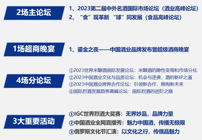 直面行业发展的“真”问题、产业转型的“实”问题、政策引领的“新”问题和企业营销的“小”问题,是名酒展组委会开展论坛活动的初衷所在。本届大会将凝聚多方力量,联袂开展川商投资洽谈会、俄罗斯文化节及汇演、中外国际烈酒产地市长论坛、IGC世界烈酒大奖赛、中国酒业全网直播秀、2023世界米酿酒国际发展论坛、2023中国酒业跨界合作论坛、国际烈酒发展趋势高峰论坛、2023中国酒业文化与品质论坛等一系列论坛及活动。